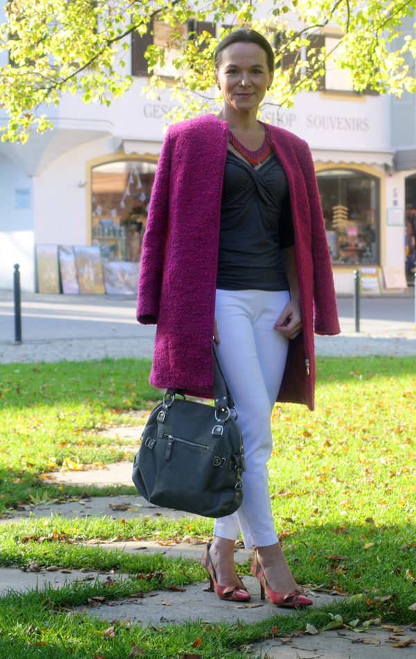 Obwohl Pink nie meine Lieblingsfarbe war, auch als Kind nicht (damals gab es aber auch noch keine pinken Barbie und Hello Kitty Welten!) habe ich mittlerweile herausgefunden, dass diese kräftige Farbe meinem Hautton schmeichelt. Zartrosa, wie auch andere Pastelltöne übrigens nicht, Hellblau sieht an mir zum Beispiel total langweilig aus und macht mich blass. Außer im Sommer, wenn ich eine leichte Bräune habe, aber dann sieht eh fast alles gut aus...